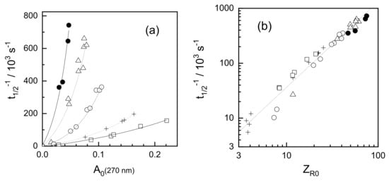Pulse radiolysis of poly(ethylene oxide), Mn = 218 kDa, in N2O-saturated aqueous solutions. PEO concentrations (in monomer units): 5.7 mM (●), 11 mM (△), 23 mM (◯), 57 mM (+) and 91 mM (☐). Rate of radical recombination (approximated as reverse half-life): (a) As a function of initial absorbance (proportional to the initial radical concentration); (b) As a function of the initial average number of radicals per chain (ZR0). Adapted with permission from [73]; published by Elsevier, 1995.