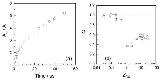 Pulse radiolysis of poly(ethylene oxide) in dilute N2O-saturated aqueous solutions: (a) Kinetics of radical recombination in the second-order kinetics coordinates (Mn = 218 kDa, polymer chain concentration 2.2 μM, initial radical concentration ca. 120 μM, ZR0 ca. 54); (b) Dependence of the α parameter (Equation (5)) on the average initial number of radicals per chain, ZR0. Data for PEO oligomer (Mn = 400 Da) at oligomer chain concentrations of 110 μM (+) and 1100 μM (◇), as well as for PEO standards of Mn = 23 kDa (polymer chain concentration 19 μM, ☐), Mn = 94 kDa (polymer chain concentration 4.7 μM, △) and Mn = 277 kDa (polymer chain concentration 1.6 μM, ◯). Adapted with permission from [73]; published by Elsevier, 1995.