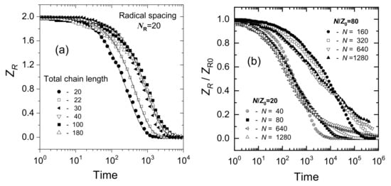 The dispersive kinetics model stipulates that the reactivity distribution changes over time. The reason why this should happen in the process of intramolecular crosslinking became clear when Monte Carlo simulations (Cooperative Motion Algorithm, CMA) were employed [76]. It turns out that if only two radicals are generated on a polymer chain and the distance between these two radicals, NR, is constant, their recombination follows classical kinetics and the rate depends almost solely on NR, with only slight effect of the polymer chain length N (Figure 8a). For random initial radical distribution along the chain, the average initial NR value is the main factor controlling the kinetics. Figure 8b illustrates the fact that kinetics of radical recombination on chains of different length N is similar if the average inter-radical distance along the chain, NR, approximated as N/ZR0, is constant.
