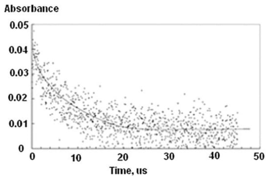 Decay profile kinetics at 390 nm of C-centered radicals in pulsed N2O-saturated aqueous solutions of 2.54 × 10−6 mol L−1 PVP (Mw = (3.94 ± 0.12) × 105 g mol−1) at 25 °C, pulse width 3 μs, dose per pulse 32 Gy. Adapted with permission from [22]; published by Elsevier, 2011.