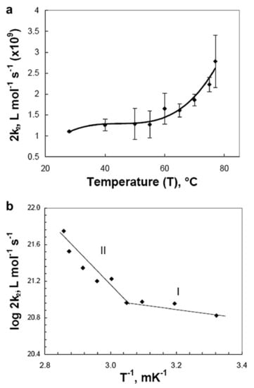 As shown from Figure 11a, the bimolecular decay of the (2k2) values rise much more steeply with increasing temperature in the high temperature range (55 °C to 77 °C) than in the low temperature range (28 °C to 50 °C). As a result, the Arrhenius plot reveals two activation energies, as depicted in Figure 11b. The data for the high temperature region (above 55 °C) yields a higher Ea of (28.5 ± 7.9) kJ mol−1 than the data for temperatures below 55 °C (4.2 ± 1.7) kJ mol−1.