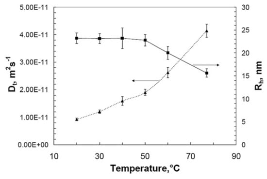 Dt and Rh of PVP polymer chains (Mw = (3.94 ± 0.12) × 105 g·mol−1) as a function of temperature. Adapted with permission from [22]; published by Elsevier, 2011.