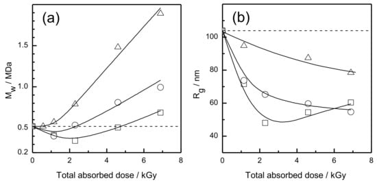 Intermolecular crosslinking creates high molar mass species by linking many chains together, and further, beyond the gelation dose, leads to the onset of a 3D macroscopic gel. This is a standard way to synthesize hydrogels using ionizing radiation, and also a base of the industrially employed technology of production of hydrogel wound dressings [55,56]. Intramolecular crosslinking, on the other hand, by inducing loop formation on single coiled polymer chains, creates collapsed three-dimensional internally crosslinked chains (referred to as nanogel particles) without an increase in molar mass [57]. In drug delivery, small particle size such as with these nanoparticles, is essential in transporting bioactive molecules to target sites.