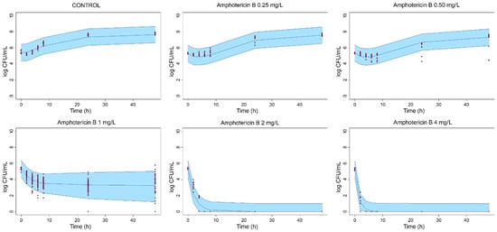 The results obtained in this study should be cautiously interpreted, as in vitro-in vivo correlation studies for amphotericin B against C. auris are lacking. Even though T-K curve methodology is a more complex technique that provides further information than MIC determination, it is still an in vitro approximation to the much more complex in vivo reality. Factors such as host immunity status and drug tissue distribution are overlooked, whereas fungal burden may be overestimated, as growth rate is much faster in the rich environment of the microbiological broth culture than in the human infection sites []. Nevertheless, the developed model and simulation results may help in the design of future preclinical and clinical studies, providing a useful tool for dosing regimen selection. It would also be of interest to further confirm in a murine candidiasis model if the MIC of 1 mg/L is linked to treatment failure.