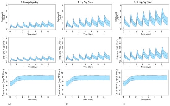 Predicted total (top row) and unbound (mid row) plasma concentrations of amphotericin B (D-AMB) and the effect on fungal burden (bottom row) for the treatment of 0.6 mg/kg/day (a), 1 mg/kg/day (b) and 1.5 mg/kg/day (c) of amphotericin B. The mean (solid line) and 95% prediction interval (coloured space) are represented.