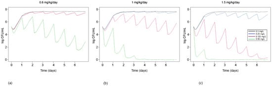 Additional simulations with MIC scenarios of 0.06, 0.125, 0.25 and 0.5 mg/L (with EC50 of 0.12, 0.24, 0.47 and 0.94 mg/L, respectively) for a 1-week period are presented in Figure 4.