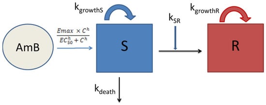 Schematic illustration of the final PK/PD model. The total fungal population consists of two different subpopulations (S + R), with a first-rate order constant (kSR) that describes the transfer of fungal cells from a susceptible state (S) to a resistant one (R). Amphotericin B (AMB) exerts its effect on the susceptible subpopulation. kgrowthS: growth-rate of susceptible subpopulation; kgrowthR: growth-rate of resistant subpopulation. kdeath: death-rate constant of the susceptible subpopulation.