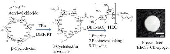 Synthesis of HEC/β-CD cryogel via cryogenic treatment and photochemical crosslinking in a frozen state.