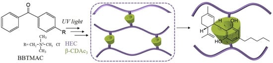 Firstly, the oligosaccharide β-CD was transformed into a crosslinking agent bearing acrylate groups via reaction with acryloyl chloride in the presence of triethylamine as described elsewhere [25,26]. To obtain a multifunctional crosslinking agent, i.e., several acrylate groups per one β-CD molecule, a given excess of acryloyl chloride was used. The 1H-NMR analysis of the isolated reaction product revealed a degree of substitution (DS) of about three. The calculation was made considering the relative peak integrals assigned to the vinyl protons of 5.8–6.5 ppm and the β-CD protons at 5.0 ppm (Figure S1). Next, the super-macroporous cryogels were synthesized by a protocol including the cryogenic treatment (freezing for 2 h) of aqueous solution of HEC, β-CDAc3 and BBTMAC, and UV irradiation for 5 min. Figure 2 schematically represents the formation of a three-dimensional HEC/β-CD polymer network designed for “host-guest” complexation between CBD and β-CD inner cavity. We assumed that HEC and β-CDAc3 were incorporated into the polymer network equivalently to their initial mass ratios. This was confirmed by experiments based on the inclusion of phenolphthalein in the β-CD cavities of cryogels. Considering that the inclusion complex β-CD/phenolphthalein follows the 1:1 stoichiometry [27], the calculated fraction of β-CD in cryogels was identical to the fraction in the reaction mixture.