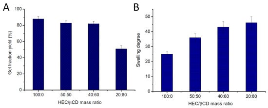 Effect of HEC/β-CDAc3 mass ratio on the gel fraction yield (A) and swelling degree of cryogels (B).