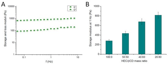 Storage (G′) and loss (G′′) moduli of HEC/β-CD (2:8) cryogels as a function of frequency (A), and effect of HEC/β-CD mass ratio on the storage modulus of cryogels (B).