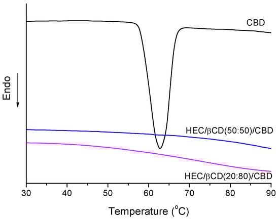 DSC measurements provided additional information about the phase state of CBD loaded in HEC/β-CD carriers. Melting curves of pure CBD and HEC/β-CD cryogel of two different compositions are shown in Figure 6. The pure CBD is a crystalline white solid which exhibited a melting peak at 63 °C. This peak was not detected for the CBD-loaded cryogel samples, suggesting that CBD is in an amorphous state probably due to the loading procedure and/or some specific interaction with the polymer matrix.