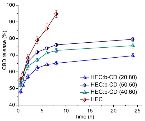 A rough idea about the CBD fraction, included in the β-CD cavities, can be attained from in vitro drug release experiments. The release profiles of cannabidiol from hydrogel matrixes of different compositions (HEC/β-CD 100:0, 50:50, 40:60, and 20:80) were studied and the corresponding graphs are presented in Figure 7. The release studies were conducted in an acetate buffer solution (pH 5.5) at 35 ± 0.5 °C, in accordance with the potential dermal route of application of the elaborated cryogel systems. The pure HEC cryogel is characterized by rapid drug release—about 96% of cannabidiol was released within the first 6 hours of the experiment. In this sample, CBD is not involved in complex with β-CD. In contrast, the HEC/β-CD cryogels quickly released about 50% of the loaded CBD, followed by a significantly slower release of another portion of CBD. In fact, for the period of 24 h, less than 80%, 70%, and 63% of the total amount of CBD was released from the carriers comprising 50%, 60%, and 80% of β-CD moiety, respectively. The higher the content of β-CD, the lower the percentage of released CBD from the matrix. From the obtained results, we can conclude that β-CD-modified polysaccharide matrixes may serve as feasible carriers providing high entrapment efficiency and bi-phasic drug release for the hydrophobic drug CBD.