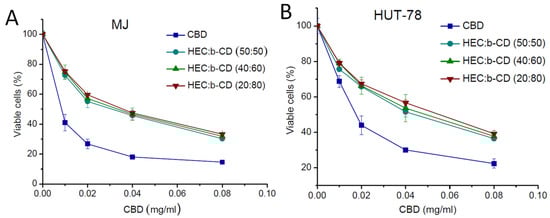 The cell growth inhibitory effect of CBD-loaded HEC/β-CD cryogels was investigated in a comparative fashion vs. free CBD against two human tumor cell lines -MJ (CTCL-Mycosis fungoides) and HUT-78 (cutaneous T-cell lymphoma). A standard MTT test, based on the enzymatic reduction of the yellow tetrazolium salt MTT to a violet MTT–formazan by the mitochondrial succinate dehydrogenase of vital cells, was used with minor modifications [28]. The concentration–response curves are shown in Figure 8 and the half-inhibitory concentrations (IC50) calculated thereof are presented in Table 1. The presented data indicate that free CBD (applied as ethanol solution) and the formulated CBD showed concentration-dependent cytotoxicity, but the anti-proliferative effect of the free drug is higher as compared to formulated CBD. Thus, IC50 values of the β-CD-containing cryogels were slightly higher than those of the free drug (with an identical magnitude of modulation) in both cell lines.