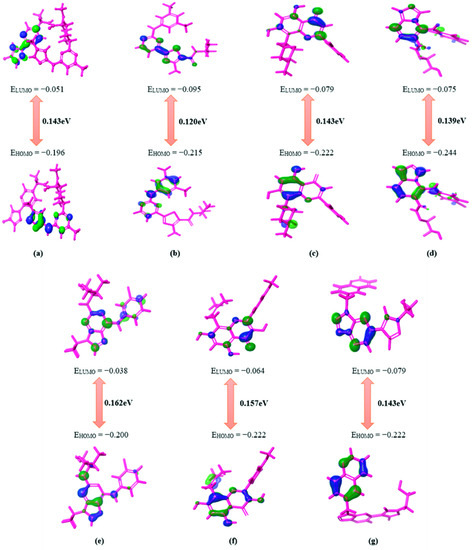 Graphical representation of HOMO–LUMO energy gap calculation for reference (a) Pralsetinib and hit compounds (b) DB07194, (c) DB03496, (d) DB11982, (e) DB04751, (f) DB12672 and (g) DB12848.