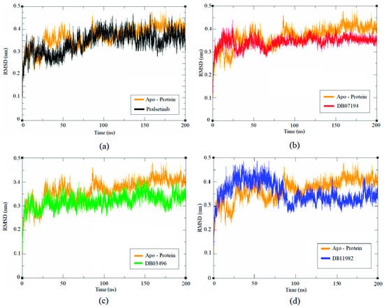 Time evolution of RMSD values for the apoprotein and protein–ligand complexes: (a) Pralsetinib, (b) DB07194, (c) DB03496 and (d) DB11982.