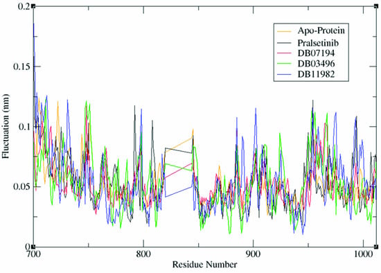 RMSF depicts the flexibility of protein residues within the protein–ligand complex. As demonstrated in Figure 3, a similar pattern of fluctuation in the backbone was observed among all four systems. The region between Val871–Asp898 exhibited the least fluctuation, with less than ~0.05 nm, indicating the contribution of these residues to stable binding of predicted inhibitors with the RET receptor. Notably, important residues such as Asn879 and Asp892 showed fluctuations of ~0.04 nm, which were found within the conserved interaction region. It is to be noted that the presence of a highly stable protein–ligand complex was due to the formation of hydrogen bonds between these residues and the inhibitors. The other residues, Met700–Lys722 and Pro957–Arg982, showed high flexibility of about ~0.1 nm, suggesting that these residues contributed less to the RET–ligand interaction. These results are correlated well with the ligand interaction pattern discussed earlier. Moreover, a lower RMSF value depicts the well-organized region whereas a high RMSF value indicates loosely structured terminal ends of the complex [33]. In the present study, the apoprotein exhibited an RMSF value of 0.0696 nm whereas the complexes RET–Pralsetinib, RET–DB07194, RET–DB03496, and RET–DB11982 showed 0.069, 0.0665, 0.0773, and 0.033 nm RMSF values, respectively. The RET–DB07194 and RET–DB11982 complexes showed decreased RMSF values in comparison with the apoprotein and RET–pralsetinib complexes. This clearly depicts that the binding of lead molecules resulted in decreased flexibility of the catalytic residues. Hence, the identified lead compounds were very well positioned in the binding pocket of RET protein compared with other compounds considered in our analysis.