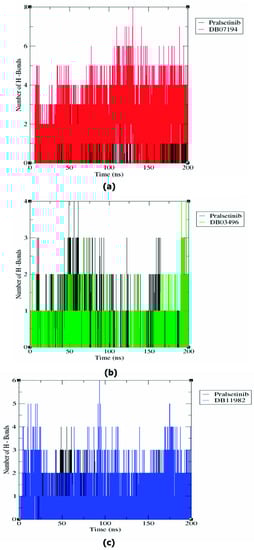 The stability of a protein–ligand complex is usually analyzed based on different types of transient interactions, including electrostatic interaction, Van der Waals, hydrogen bonds, and many others [45]. Among them, the hydrogen bond is regarded as an important transient interaction facilitating the binding of ligands with protein. The existence of hydrogen bonds in the complex structures was calculated from the MD trajectory. The RET–DB7194, RET–DB03496, and RET–DB11982 showed 0–8, 0–4, and 0–6 H-bonds, respectively (Figure 4). These observations demonstrated that the predicted hits showed a higher number of H-bonds than the reference drug during simulation. From the results of the H-bond analysis, it can be concluded that the predicted compounds form a more stable interaction with the RET protein than pralsetinib.