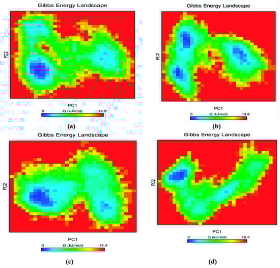 Contour plot demonstrating free energy landscapes of (a) RET–Pralsetinib, (b) RET–DB07194, (c) RET–DB03496 and (d) RET–DB11982 during 200 ns MD simulation.