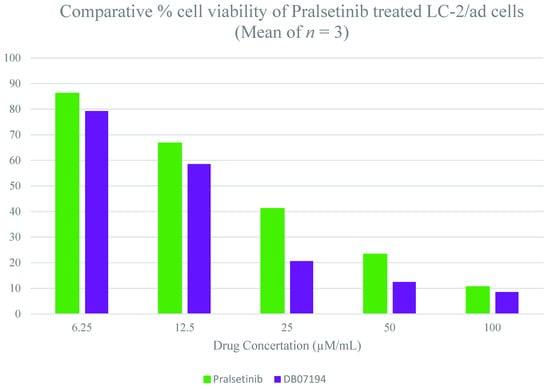 Finally, the inhibitory activity of pralsetinib and DB07194 was assessed against LC-2/ad cell lines using a colorimetric MTT assay. The compounds were examined and compared at five different concentrations, 6.25, 12.5, 25, 50, and 100 µM/mL, respectively. The experiment was performed in triplet to overcome the experimental error. Figure 6 and supplementary Table S7 (see Supplementary Materials) represent the comparative cell viability upon treatment with pralsetinib and DB07194. A similar pattern of inhibition was observed between pralsetinib and DB07194 at concentrations 6.25 and 12.5 µM/mL. Interestingly, a sudden rise in the inhibition of LC-2/ad cell using DB07194 was noted at 25 µM/mL, whereas only a smaller variation was observed on using pralsetinib at the same concentration. The inhibitory action does not show much deviation after 50 µM/mL of drugs, which shows the saturation level of inhibition. Overall, LC-2/ad showed higher sensitivity to DB07194 (IC50 = 12.48 µM) than pralsetinib (IC50 = 23.31 µM). Consistent with its anti-cancer activity, both pralsetinib and DB07194 can decrease the cell viability more significantly than control. Moreover, the anticancer property of DB07194 reveals different pharmacological properties of the compound tested earlier in the experiments as an SYK inhibitor [48,49]. Subsequently, one-way ANOVA analysis was implemented to examine the significance of the difference in cell viability between the control and drug-treated samples. A p-value of less than 0.001 is observed between the control and drug-treated sample. This highlights the statistical significance of the experimental data carried out in our study. In addition, no literature evidence has been reported on the toxicity and side effects of the compound. Hence, the toxicity of the hit molecule was also assessed using the ProTox II server and compared against pralsetinib [50]. For instance, predicted LD50 values of pralsetinib and DB07194 were found to be 800 mg/kg and 681 mg/kg, respectively, and thus fall into the class four (slightly toxic) category of compounds. All these data are evidence that the identified hit molecule, DB07194, belongs to an experimental subset of the DrugBank database, displaying favorable drug-like properties and potential progression into clinical application. Thus, it could be considered for the treatment of RET-positive NSCLC, a contrast to the properties for which it was originally designed and synthesized.