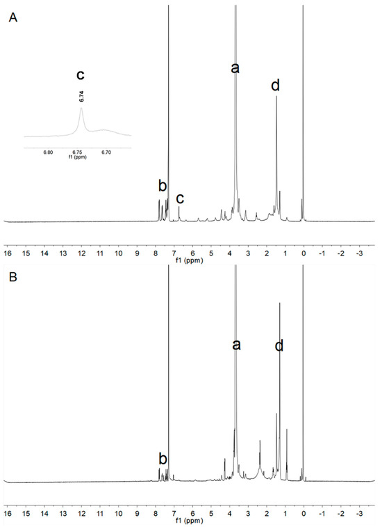 Determination results of Fmoc-Lys-PEG and Fmoc-Lys-PEG-RGD. (A) 1H-NMR spectra of Fmoc-Lys-PEG. (B) 1H-NMR spectra of Fmoc-Lys-PEG-RGD. a: 3.5–3.8 ppm, PEG; b: 7.0–7.3 ppm, Fmoc; c: 6.7 ppm, Mal; d: 1–2 ppm, Boc.