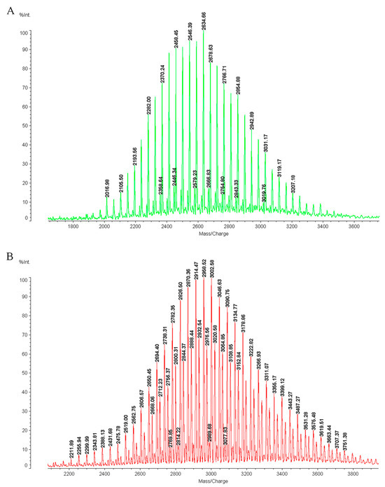 Determination results of Fmoc-Lys-PEG and Fmoc-Lys-PEG-RGD. (A) MALDI-TOF-MS spectra of Fmoc-Lys-PEG. (B) MALDI-TOF-MS spectra of Fmoc-Lys-PEG-RGD.