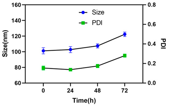 The stability of micelles is of great significance to the application of micelles. As can be seen from Figure 4 and Figure 5, the particle size and PDI of NPs can remain basically stable within 48 h under the condition of 4 °C. However, with the extension of time, the particle size and PDI of the carrier will gradually become larger.
