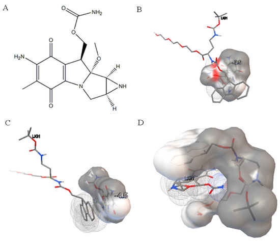 Prediction and analysis of the MMC-loading mechanism of nanoparticles. (A) The structure of MMC. (B) Fmoc-Lys-PEG was the ligand and MMC was the receptor. (C) Fmoc-Lys-PEG was the ligand and MMC was the receptor (Fmoc limited binding pocket). (D) MMC was the ligand and Fmoc-Lys-PEG was the receptor.