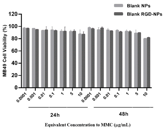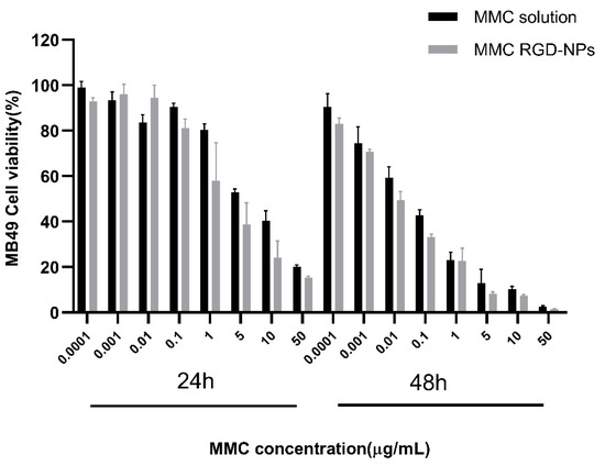 The cell viability of MB49 cells compared to the MMC solution and MMC RGD-NPs for 24 or 48 h.