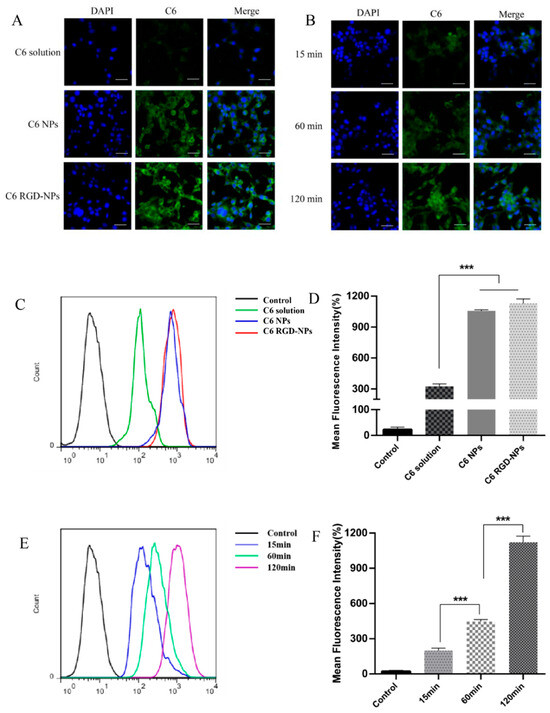 The intracellular uptake efficiency of C6-labeled NPs was also quantitatively determined by flow cytometry. As shown in Figure 10C,D, the intracellular uptake efficiency of the C6 NPs was much stronger than that of free C6, and the C6 RGD-NPs were more efficient compared with the C6 NPs, but there was no significant difference between them. Figure 10E,F show the effect of the different incubation times on C6 RGD-NP uptake. The results show that, with the extension of incubation time, the fluorescence signal intensity increases, indicating an increase in cell uptake.
