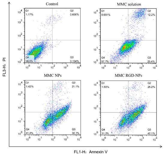 In order to evaluate the effect of MMC NPs on the apoptosis of tumor cells, MB49 cells were cultured with MMC NPs, MMC RGD-NPs, and MMC solution for 24 h, then the cells were treated with Annexin V-FITC/PI, and the proportion of apoptotic cells was analyzed by flow cytometry. After co-incubation with the tumor cells for 48 h, as shown in Figure 11, the apoptosis rate of the MMC NPs group and the MMC RGD-NPs group was 57.2% and 67.3%, respectively, which was significantly higher than that of the MMC group (41.6%).