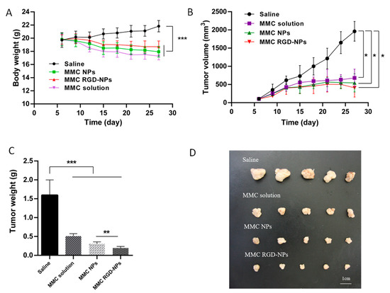 Studies of antitumor efficacy of MMC RGD-NPs in vivo. (A) Body weight of mice treated with saline, MMC solution, MMC NPs, MMC RGD-NPs (mean ± SD, n = 5). (B) Tumor volume of mice treated with saline, MMC solution, MMC NPs, MMC RGD-NPs (mean ± SD, n = 5). (C) Weight of isolated tumors in groups of saline solution, MMC solution, MMC NPs, MMC RGD-NPs (mean ± SD, n = 5). (D) Isolated tumor tissues of mice treated with saline, MMC solution, MMC-NPs, MMC-RGD-NPs (mean ± SD, n = 5), * p < 0.05, ** p < 0.01, and *** p < 0.001 to control.