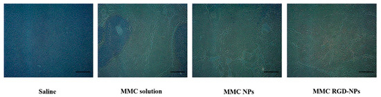 TUNEL assay of tumor tissues isolated from mice treated with saline, MMC solution, MMC NPs, MMC-RGD-NPs, and observed by optical microscope, 100×. Scale bar = 50 μm.