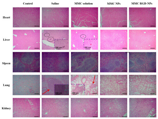 In order to further observe the metastasis of tumor in various organs, after treatment, the heart, liver, spleen, lung, and kidney tissues of the mice in each group were isolated and stained with H&E, and the results are as shown by Figure 14. In the saline group, there were large tumor metastases and capillary hyperplasia around the metastases. Small tumor metastases were observed in the lung tissues of the mice in the MMC solution group, accompanied by significant alveolar septal thickening and the destruction of the alveolar structure. The structure of the lung tissue in the drug-loaded NPs group was similar to that of the normal mice, and no lung metastasis occurred. According to the H&E staining results of the liver tissues, scattered small nodular tumor liver metastases were found in the liver tissues of mice in the saline and MMC solution groups, while the morphology of the liver tissues in the other groups was normal, and no significant liver metastases were found. According to the H&E staining results of the heart, spleen, and kidney tissues, the morphology of the heart, spleen and kidney tissues in each group was normal, and no tumor metastasis was found. The H&E results suggested that the MMC NPs and MMC RGD-NPs groups showed a better ability to inhibit tumor metastasis than the MMC solution group.