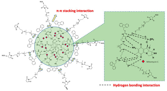 Therefore, we designed and synthesized a type of polymer material, Fmoc-Lys-PEG and Fmoc-Lys-PEG-RGD. These copolymers can self-assemble into micelles driven by π–π stacking and the hydrophobic interaction of the Fmoc motif and, at the same time, form the framework of a hydrogen-bonding environment in the core, as shown in Scheme 1. Water-soluble MMC could be encapsulated inside the carrier by the hydrogen-bonding force, and we also confirmed it by means of molecular simulation. Given that RGD peptides can target integrin receptor that is highly expressed on the endothelial cells of neocapillaries in malignant tumors [18,19], according to the defects of MMC treatment in bladder cancers, c(RGDfc) peptides were also introduced on the surface of the carrier [20], thus further improving the therapeutic effect on bladder cancer. It is hoped that, through our work, we can provide some ideas for the micellar encapsulation of hydrophilic drugs, and also provide some reference for the treatment of bladder cancer.