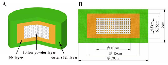 Design diagram of the three-layer nested structure model. (A) Three-dimensional section view (from inside to outside: hollow powder layer; PN layer; outer shell layer); (B) Dimension drawing of the side view model.