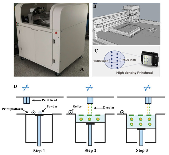 Diagram of the self-developed binder jet 3D printer. (A): Physical view of the device; (B): Print platform; (C): Print head; (D): Print process diagram.