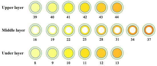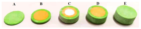 The 3D-printed compound dispersible tablets were made of 50 layers, each containing a 180 μm thick layer of powder. Figure 3 shows a single-layer section of the PN-containing layer with a diameter of 20 mm and thickness of 9 mm. The numbers in the diagram represent the number of printing layers (1–7 and 45–50 were the outer shell layers), and there were three regions, the upper, middle and under layers, with a total of 37 layers, among which both the upper and under layers had six layers, and the middle layer had a total of 25 layers. The green area is the outer shell layer, the white area is the hollow layer, and the yellow area is the PN layer; the deeper the yellow area is, the greater the drug content. Figure 4 shows the results of the compound LEV-PN dispersible tablet produced using BJ-3DP. All tablets showed smooth surfaces and regular geometric shapes, and the partitioning between the outer shell layer, PN layer, and hollow layer clearly exhibited high printing accuracy.