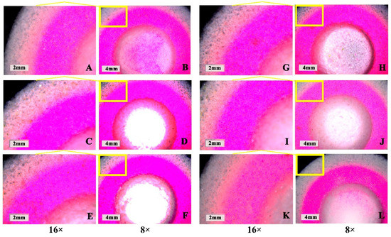 Influence of drying parameters on the “coffee ring” effect of the 3D-printed compound multicompartmental dispersible tablet. (A,B): Ordinary drying at 30 °C; (C,D): Ordinary drying at 40 °C; (E,F): Ordinary drying at 60 °C; (G,H): Ordinary embedding drying at 40 °C; (I,J): Vacuum drying at 40 °C; (K,L): Vacuum embedding drying at 40 °C.