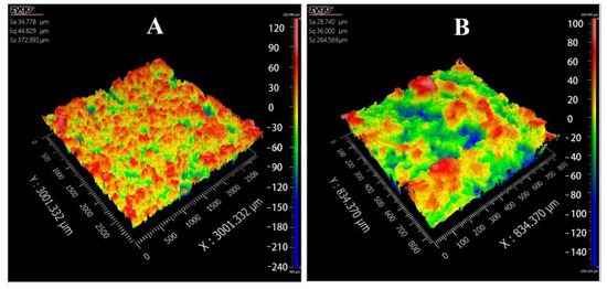 The surface roughness of the tablets was measured with a three-dimensional white-light interference profilometer (Nexview, ZYGO, Middlefield, CT, USA). The tablets were observed with objective magnifications of 2.75× and 10× and an eyepiece magnification of 1× to evaluate the characteristic surface roughness parameters such as maximum height (Sz), arithmetic mean height (Sa), and root mean square height (Sq), where Sz is the sum of Sp and the maximum valley depth (Sv).