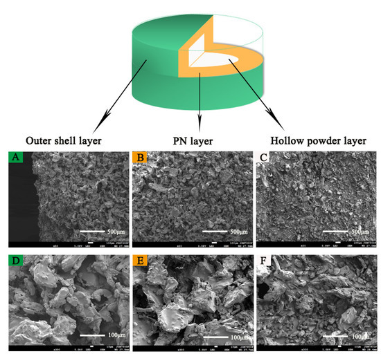 SEM image of the 3D-printed compound multicompartmental structure. (A): Outer shell layer (50×); (B): PN layer (50×); (C): hollow powder layer (50×); (D): outer shell layer (300×); (E): PN layer (300×); (F): hollow powder layer (300×).