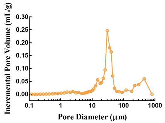 The porosity distribution plot in Figure 9 shows that the 3D-printed compound LEV-PN multicompartmental structure dispersible tablets contained an abundance of internal pores, porosities as high as 63.89%, and an average pore size of 15.65 µm. The high porosity facilitated the rapid penetration of water, which passed through these capillary channels to realize rapid dispersion of the tablets; this was benefited from layered manufacturing and layer-by-layer bonding process characteristics of the 3D-printing preparation and the structural characteristics of the hollow model [31]. However, many 3D-printed products do not have sufficient hardness for post-treatment due to high porosity and poor binding effect among particles [28,40]. In this investigation, the compound LEV-PN multicompartmental structured dispersible tablets exhibited promising mechanical performance, hardness (40.57 ± 1.46 N), and friability (1.8 ± 0.2) (for details, see Table A1 in Appendix A). This might involve two binding mechanisms [41]. On the one hand, the binder contained dissolved PVP, which was left behind when the solvents from the binder liquid evaporated [42]. On the other hand, the mixed powders contained particles of solid PVP, which were activated and acted as a binder upon the absorption of water. Thus, different binding mechanisms were combined to give the compound dispersible tablets sufficient mechanical strength.