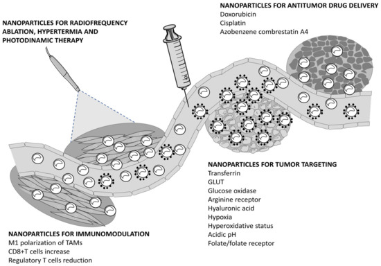 Tumor-associated macrophages (TAMs) are importantly involved in tumor development/progression and the modulation of their functions (i.e., the switch M2/M1) represents an intriguing medical option. However, the polarization of TAMs toward the M1 tumor-killing type is attenuated by the release of anti-inflammatory factors as well as by altered metabolic functions of the macrophages. Among the strategies considered to promote the activation of TAMs, the use of NPs inducing FERR proved efficacy [59,60,61].