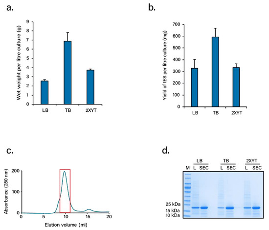 Expression of tES. (a) Comparison of wet weight of bacterial cell mass produced in LB, TB, and 2XYT media. (b) Comparison of overall yields of tES expressed in LB, TB, and 2XYT media. (c) Purification of tES by size-exclusion chromatography (SEC). (Note: Fractions of the tES peak (rectangle box) were analyzed for purity in SDS-PAGE, pooled, and concentrated for various experiments). (d) SDS-PAGE analysis of purified tES compared to lysate (L).