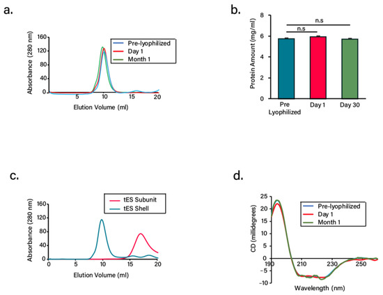 Characterization of freeze-dried tES. (a) Size-exclusion chromatogram of freeze-dried tES at pH 8.0 after storage at days 1 and 30 at room temperature. Pre-lyophilized samples were considered as control. (b) Comparison of concentrations of freeze-dried tES after storage at days 1 and 30. Pre-lyophilized samples were considered as control. (c) Size-exclusion chromatogram of the freeze-dried tES subunits after storage at day 30. The subunits were either reconstituted in 50 mM Tris-HCl pH 8.0 for their shell assembly or 50 mM sodium acetate buffer pH 5.8. (d) CD spectra of freeze-dried tES after storage at days 1 and 30 at room temperature. Compared to pre-lyophilized samples, tES exhibited double minima at 210 nm and 225 nm typical of α-helical structure (n = 3, mean ± SD).