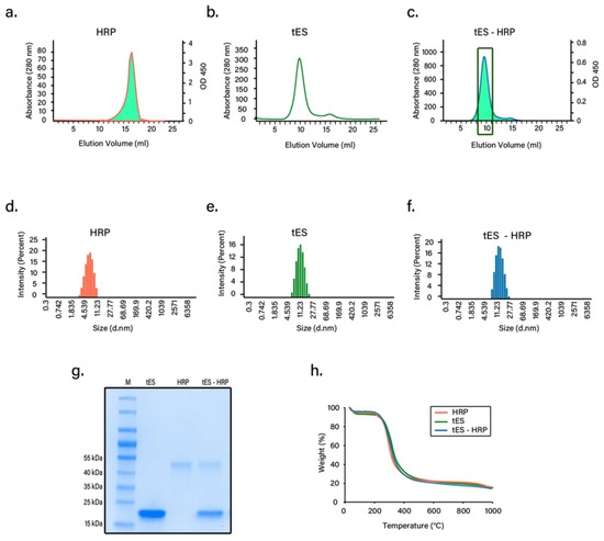 Nanoencapsulation of HRP. Size-exclusion chromatogram of free HRP (a), tES (b), and tES-HRP (c), at pH 8.0. Each fraction was analyzed for HRP activity and the data overlaid on the respective chromatogram (Note: Fractions of the tES-HRP peak (rectangle box) were pooled and concentrated for various experiments). Hydrodynamic diameter measurements of free HRP (d), tES (e), and tES-HRP (f) from DLS experiments. (g) SDS-PAGE analysis of nanoencapsulation. Lane 1 (M-protein marker), Lane 2 (tES) showing single band corresponding to ~20 kDa of subunit, Lane 3 (HRP) showing a single band of ~44 kDa, and Lane 4 (tES-HRP) showing two bands corresponding to subunit (~20 kDa) and HRP (~44 kDa). The quantification analysis of lane 4 through densitometry exhibited a 12-time higher intensity for tES (band intensity of 4.28 × 108) compared to HRP (band intensity of 3.55 × 107). (h) Thermogravimetric analysis (TGA) of the lyophilized proteins to determine the residual moisture content. The TGA curves of HRP, tES, and tES-HRP are shown.