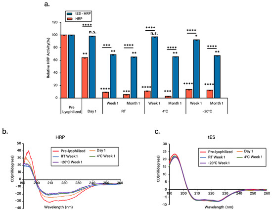 The freeze-dried tES-HRP displayed significant enzyme activity even after 1 month of storage. In all the conditions evaluated, the free HRP activity was reduced to ~10% or less after 1 week/1 month storage period. Surprisingly, tES protected the HRP activity (~70–99%) under all the storage conditions evaluated (Figure 4a, Table S1). In addition, a time-course analysis of the freeze-dried tES-HRP activity was investigated (Figure S4, see Supplementary Materials). The initial velocity (vo) expressed as a change in absorbance per unit of time (∆A652/min) was determined as 0.45/min. Two important observations were made from this study. Firstly, at RT storage, tES based nanoencapsulation preserved the activity of commercially obtained HRP in spite of the required storage conditions of −20 °C. Secondly, the encapsulated HRP activity was comparable to the pre-lyophilized sample, but free HRP activity was reduced to 70% immediately after freeze-drying. To explain this, we investigated the secondary structures of HRP and tES pre and post lyophilization. The CD spectrum of pre-lyophilized HRP was characterized by a double minimum at 209 nm and 221 nm and maxima at 194 nm, indicative of a predominant α-helical structure. After freeze-drying and subsequent storage, HRP exhibited changes in the CD spectra (Figure 4b) which could be responsible for the significant reduction in the enzyme activity. A similar reduction in the enzyme activity associated with conformational changes is previously reported [41,42]. In tES, the freeze-drying had no observable effects on secondary structure as assessed by circular dichroism (Figure 4c). Collectively, these observations suggest that tES acts as a strong lyoprotectant for the encapsulated enzyme.