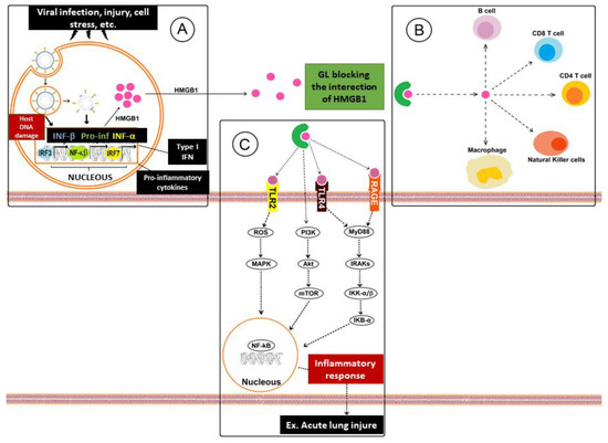 Mechanism of inhibitory action of glycyrrhizic acid in HMGB1 protein-mediated infectious diseases: (A) cells with active replicating virus become apoptotic and die, releasing type I IFN, HMGB1, and pro-inflammatory cytokines in the extracellular environment; (B) HMGB1, actively released after a viral infection, major stress, injury, etc., also acts as a cytokine that plays a modulating role in innate and adaptive immune responses, stimulating NK immune cells, macrophages, and B and T cells; (C) HMGB1 present in the extracellular environment binds to specific receptors on the surface of other cells, such as RAGE, TLR2, and TLR4, inducing the production of inflammatory cytokines, chemokines, adhesion molecules, and ROS, thus activating the signal of protein kinase pathways by NF-kB and MAPK (mitogen-activated protein kinase) to mediate inflammatory molecules.