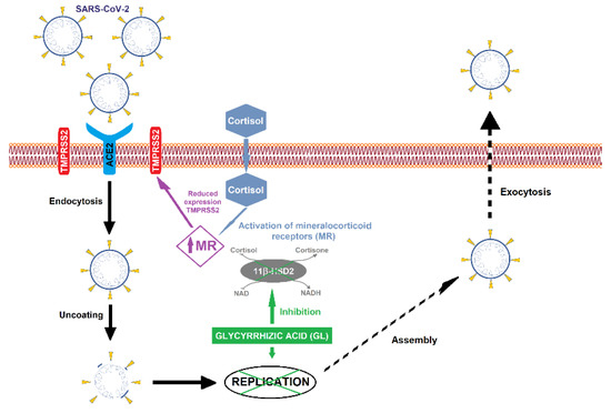 Schematic representation of glycyrrhizic acid effect on SARS-CoV-2 virus replication. The penetration of the SARS-CoV-2 virus into the cells, where it finds the ideal conditions for its replication, is mediated by ACE2 receptor with TMPRSS2 co-factor. Since ACE2 expression is regulated by MR (mineralocorticoid receptors), GL (green box) inside the cell inhibits 11β-HSD2 enzyme, allowing cortisol to activate MR. Then, the activation of MR leads to reduction of TMPRSS2 expression, causing an ACE2 downregulation. The 11β-HSD2 inhibition restricts the virus access to the cell, and consequently, the virus replication is inhibited.