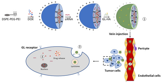 Another possible way of promoting HA-GA conjugation was achieved through the use of a linker [102]. A liver-targeted DOX and Bcl-2 siRNA (short interfering RNA)-loaded nanoparticles, composed of 1,2-distearoyl-snglycero-3-phosphoethanolamine-polyethylene glycol-polyetherimide and glycyrrhetinic acid-modified hyaluronic acid (siRNA/DOX/GH-DPP-NPs), were prepared for drug combination therapy (Figure 5). The average particle size of siRNA/DOX/GH-DPP-NPs (185.4 ± 6.4 nm) was significantly bigger than that of siRNA/DOX/DPP NPs (157.2 ± 5.7 nm), while the zeta potential in siRNA/DOX/GH-DPP-NPs (−2.64 ± 1.73 mV) was decreased for approximately 15 mV compared to siRNA/DOX/DPP NPs. These results were due to the coverage of the nanoparticles with GA-HA conjugate, which generates particles of bigger size and lower zeta potential.